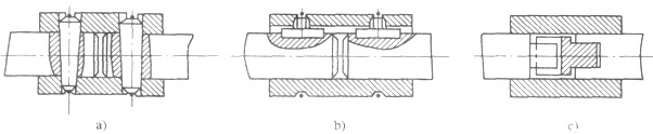 種結(jié)構(gòu)型式。其結(jié)構(gòu)簡,徑向尺寸小,但拆裝困難(要求兩中心軸線嚴(yán)格對準(zhǔn),不允許存在徑向及角度偏差),使用受到定限制。其中圖a結(jié)構(gòu)雖簡單實(shí)用,但不可靠。圖b結(jié)構(gòu)簡單,加工和安裝容易,但消除周向間隙不可靠,且易松動。圖C字滑塊聯(lián)軸器相連,滑塊的配研,這種結(jié)構(gòu)無法保證完個(gè)消除傳動間隙。