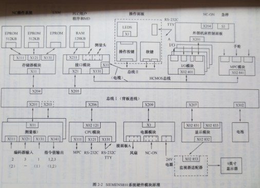 ?SIEMENS 810T/M系統(tǒng)的硬件結(jié)構(gòu)緊湊,整體體積僅相當(dāng)于放一臺14英寸電視機。圖2-1為系統(tǒng)背面示意圖,主要部件原理框圖如圖2-2所示。